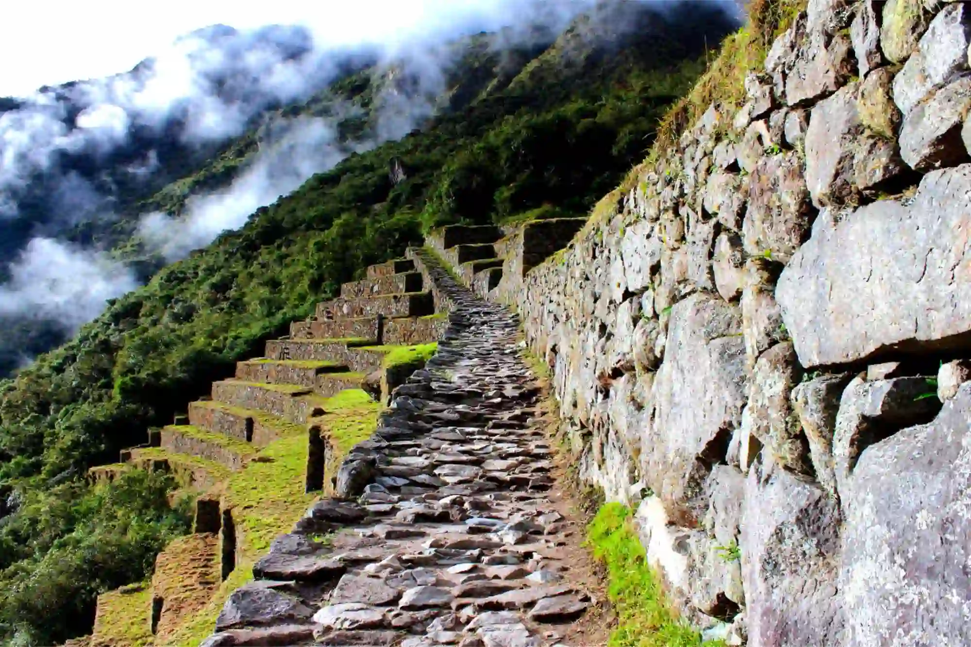 The classic Inca Trail is approximately 42 kilometers (26 miles) long and usually takes 4 days and 3 nights to complete. It includes a mix of uphill climbs, descents, and flat sections through cloud forests and ancient Inca ruins.